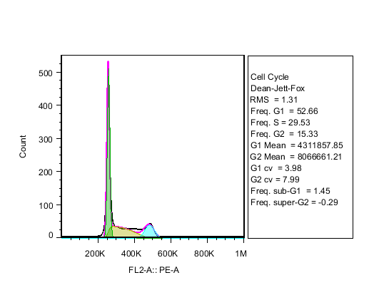 細胞內的DNA含量隨細胞周期進程發(fā)生周期性變化,如G0/G1期的DNA含量為2C,而G2期的DNA含量是4C。碘化丙啶( Propidium,簡稱PI)是一種雙鏈DNA的熒光染料。碘化丙啶和雙鏈DNA結合后可以產生熒光,并且熒光強度和雙鏈DNA的含量成正比。假定G0和G1期的細胞熒光強度為1,那么G2和M期的細胞的熒光強度為2,S期的細胞介于1和2之間。細胞凋亡時,由于細胞核皺縮和DNA片段化,染色時DNA片段會從打孔的細胞膜處丟失,流式細胞儀檢測時,熒光強度小于1,即Sub-G1峰或者凋亡細胞峰。